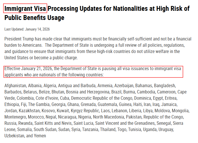 如果说 “撤签潮” 针对的是 “存量人群”,那么 1 月 14 日的 “75 国移民签证暂停令” 则瞄准了 “增量申请”。根据美国国务院通告,此次暂停的核心理由是强化 “公共负担(Public Charge)” 条款执行 —— 即筛选出 “入境后可能依赖美国福利系统” 的申请人,通过重新审查签证流程,减少公共福利支出。