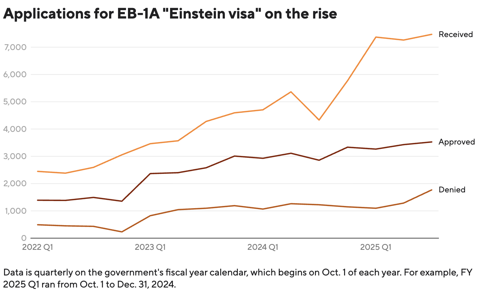 EB-1A 作为美国面向顶尖人才的 “绿卡快车道”,因其他职业签证排期积压,近年申请量迎来爆发式增长:USCIS 数据显示,2025 年 4-6 月申请量近 7500 份,较 2021 年四季度的 2500 份翻了三倍,而获批率却从 67% 跌至 50% 左右。