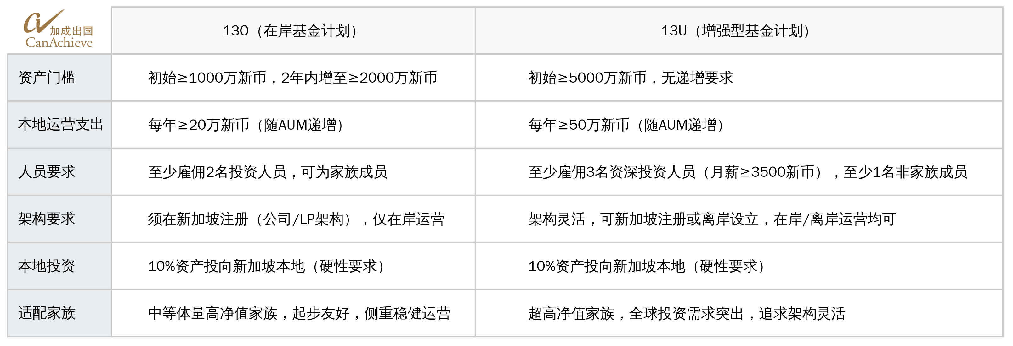 13O(在岸基金计划)与 13U(增强型基金计划)是新加坡家办最核心的两大免税计划,均面向 SFO,且享受投资收益免税的核心福利,但 2026 年新规下二者的申请门槛、运营要求、架构灵活性差异显著,需结合家族资产体量、全球投资需求选择,核心对比如下: